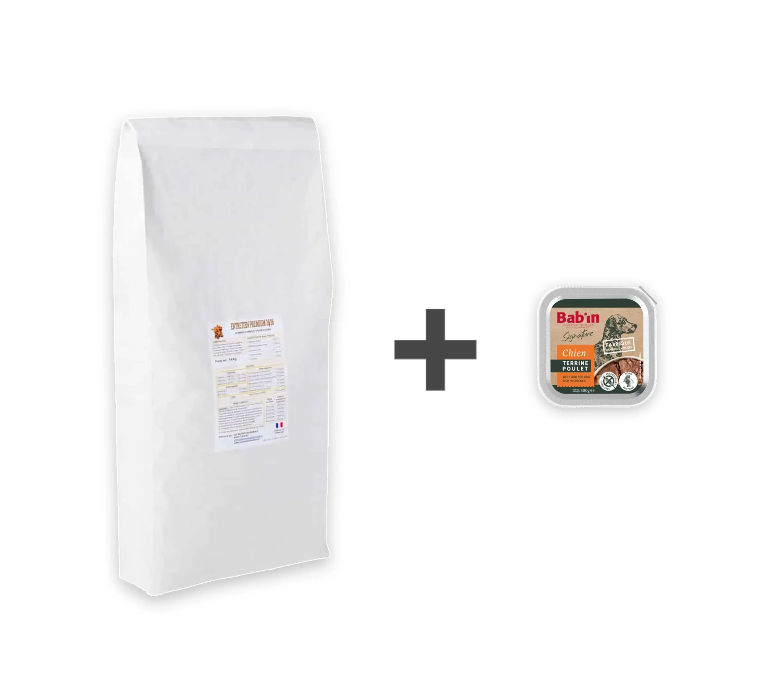 1 paquet de 14 kg de croquettes Entretien Prémium 26/16 + 1 terrine au choix.