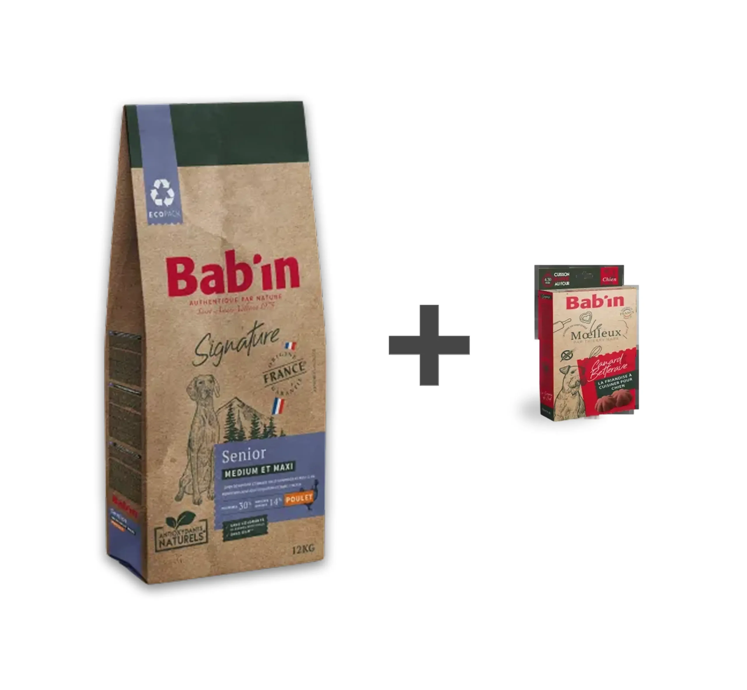1 paquet de croquettes 12 kg Senior Bab’in + 1 boîte de moelleux à cuisiner, 3 saveurs au choix.