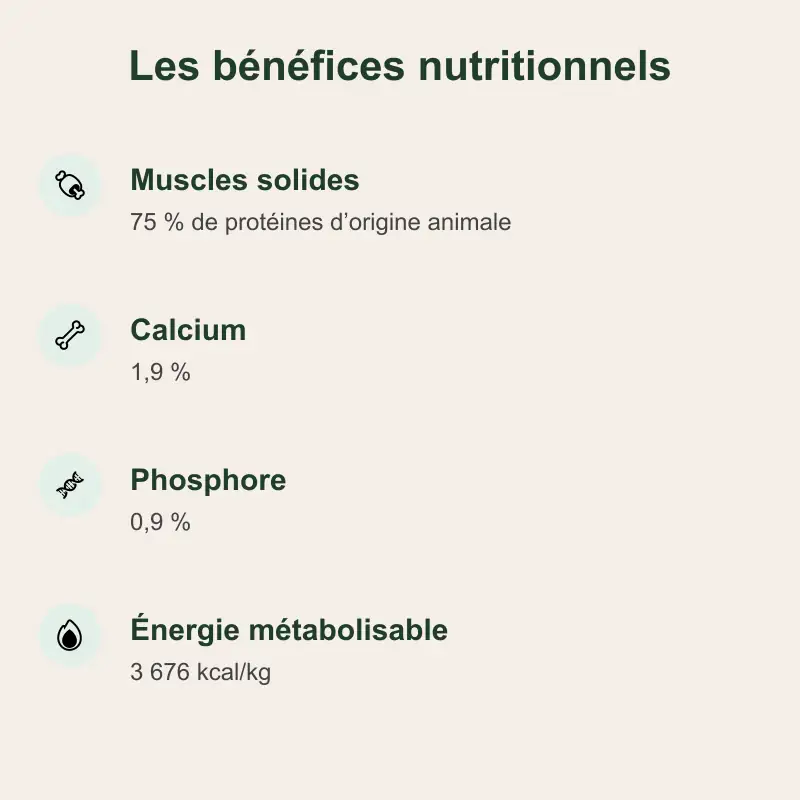 | Phosphore | 0,9 % | Participe à l’équilibre minéral et au bon fonctionnement du métabolisme |