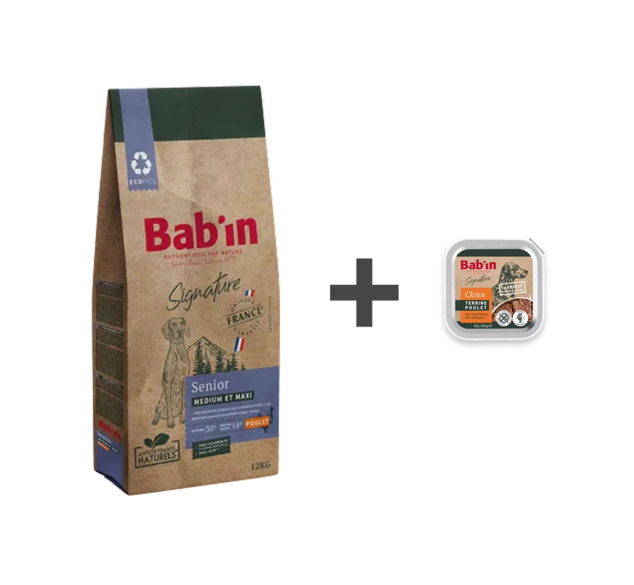 1 paquet de croquettes 12 kg Senior Bab’in + 1 terrine au choix.