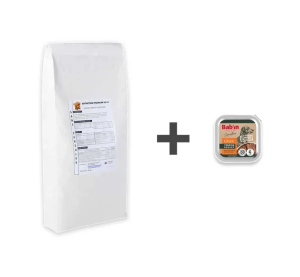 1 paquet de 14 kg de croquettes ENTRETIEN PREMIUM 26/14 + 1 boîte de terrine au choix.
