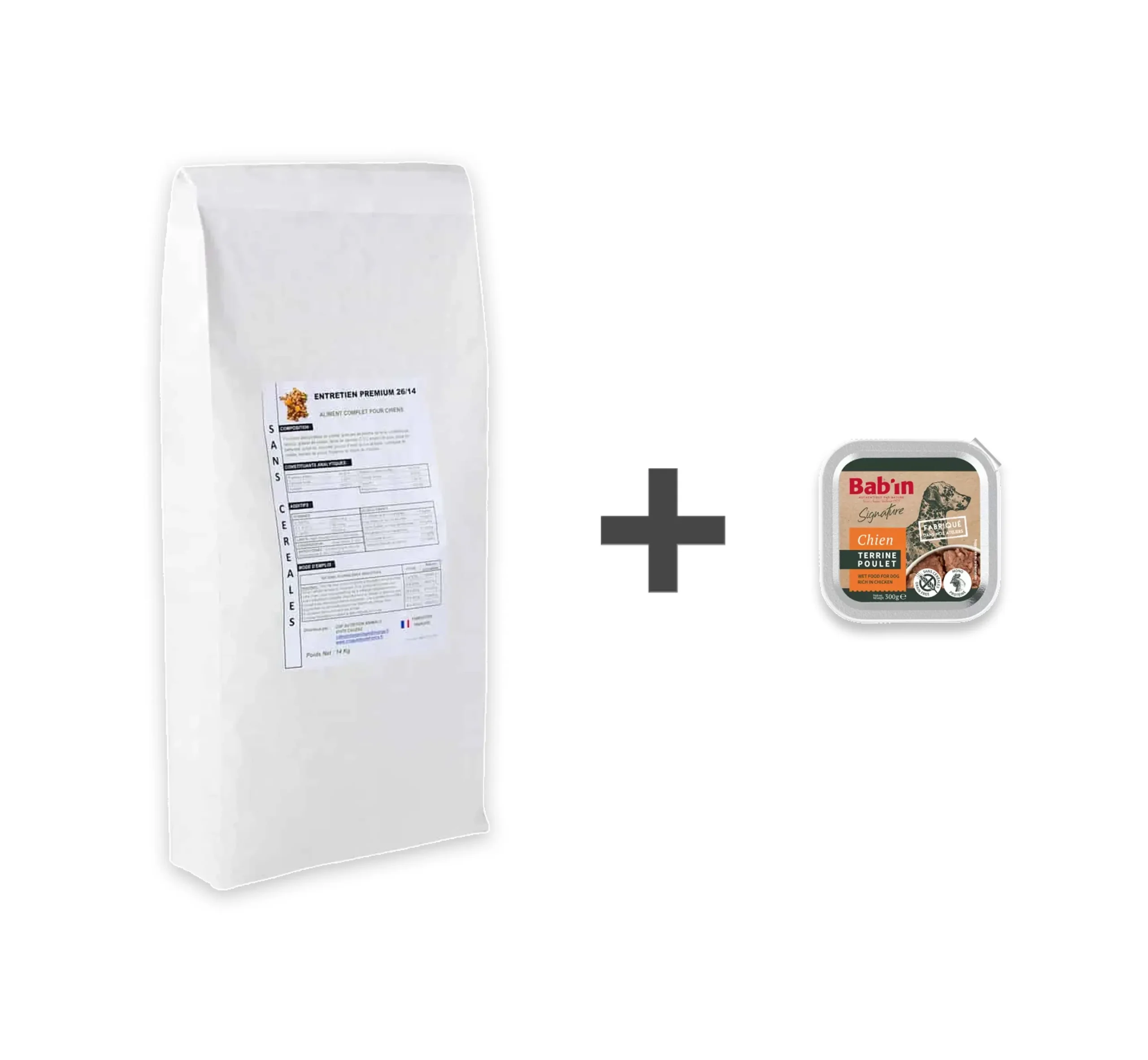 1 paquet de 14 kg de croquettes sans céréales pour chiens adulte ENTRETIEN PREMIUM 26/14 plus une terrine, saveur au choix.