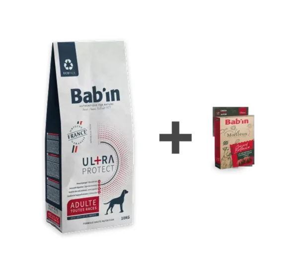 1 paquet de croquettes 10 kg Bab’in Ul+tra Protect+ 1 boîte de moelleux à cuisiner, 3 saveurs au choix.